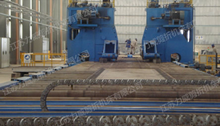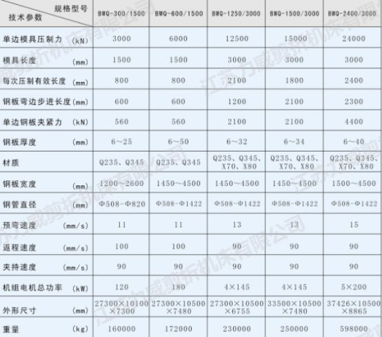 該機是大口徑直縫埋弧焊管生產(chǎn)線上的主機之一,是用于鋼板板邊預(yù)彎的專用機組。預(yù)彎機主要由C型機架、油缸單元、下橫梁、輸送輥、換模裝置、模具及移動裝置、底座、前后輸送輥道、電氣、液壓和潤滑系統(tǒng)組成。主要用于制管成型前的鋼板板邊預(yù)彎,即將制管用的鋼板經(jīng)銑變后逐段送入機器上、下模具之間,在上、下模具的壓力下使材料發(fā)生流動而彎曲,更換并調(diào)整模具的相對位置可以得到板邊曲率半徑與成品鋼管的半徑非常接近的彎邊。兩臺對放,鋼板可在兩側(cè)同時進(jìn)行彎邊。